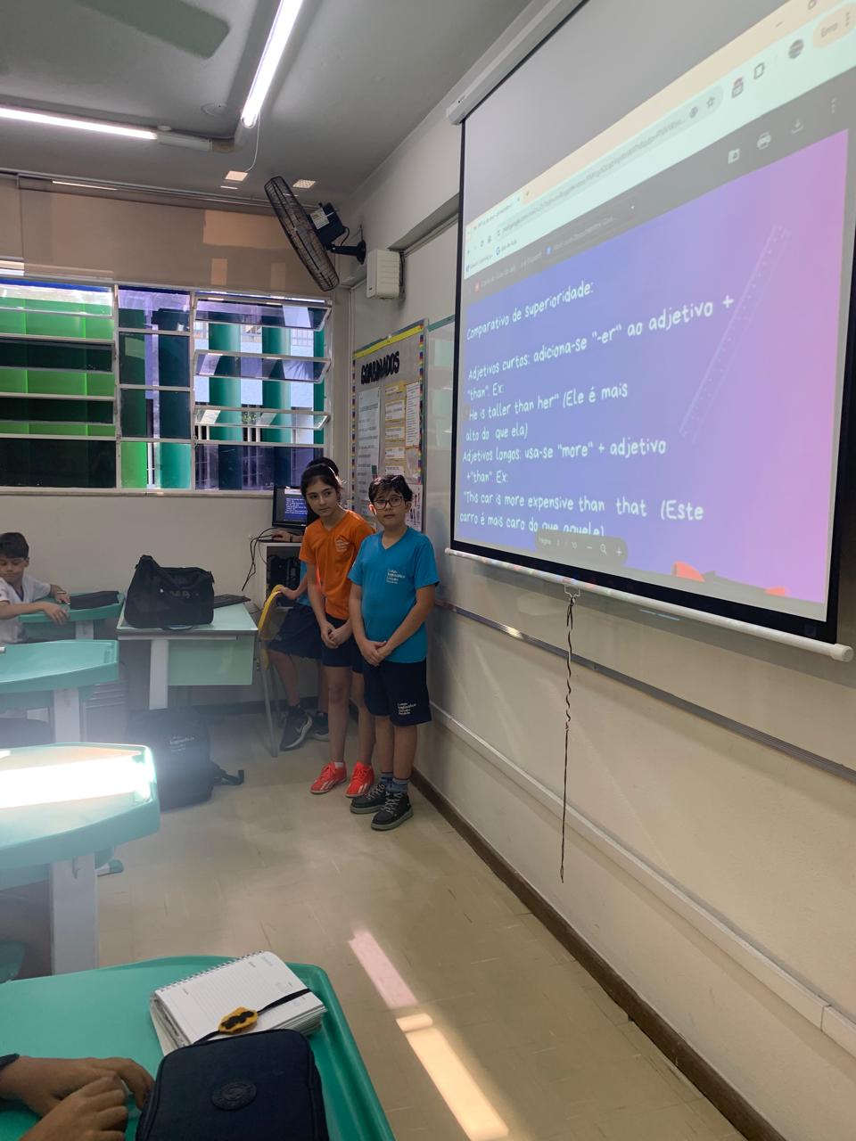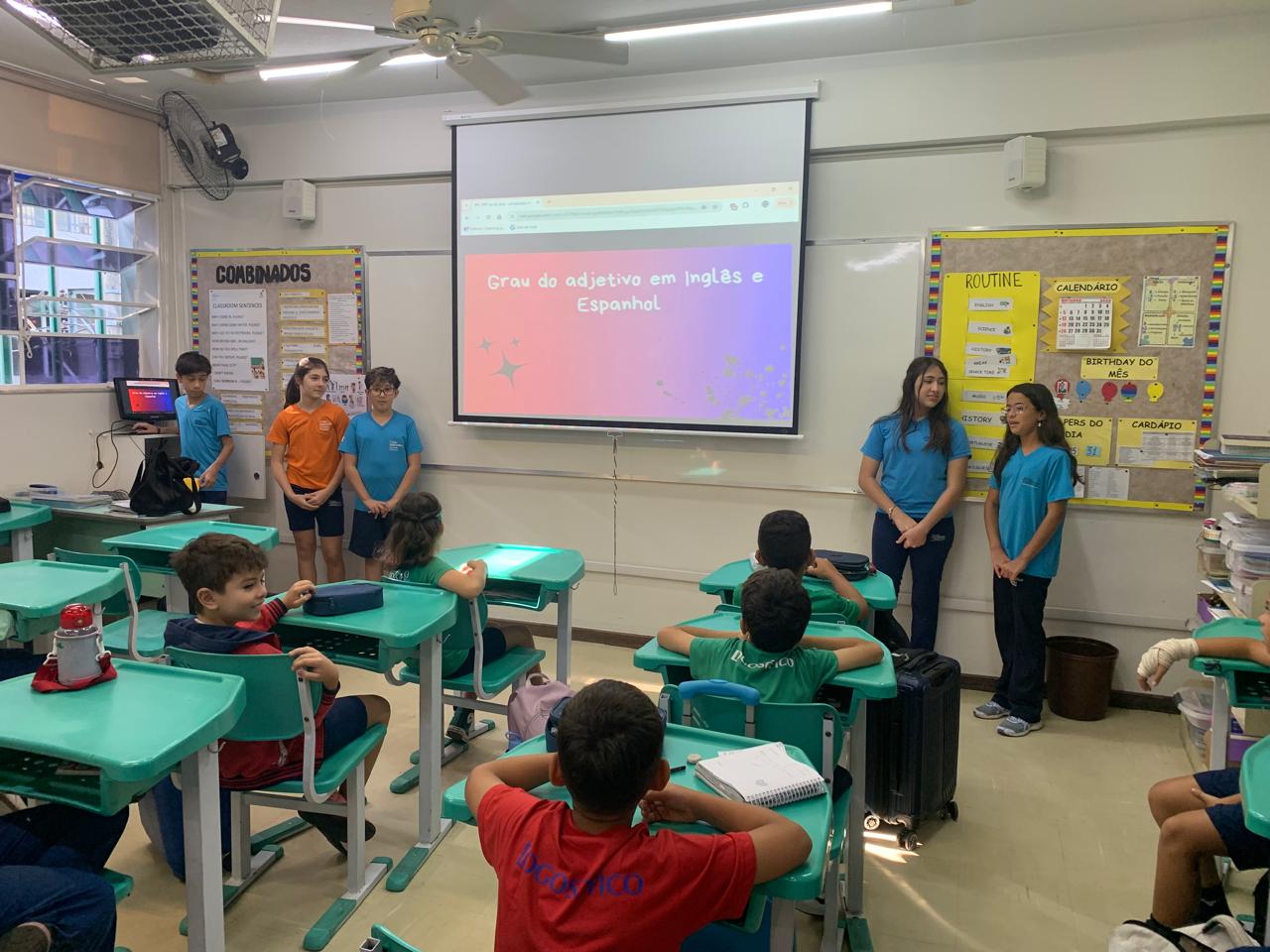 A turma do 6º Ano brilhou em uma aula especial, repleta de criatividade e protagonismo! Orientados pela professora de Língua Portuguesa, os alunos se transformaram em professores por um dia, ensinando os graus do adjetivo em inglês e espanhol para os colegas do 4º e 5º Anos.