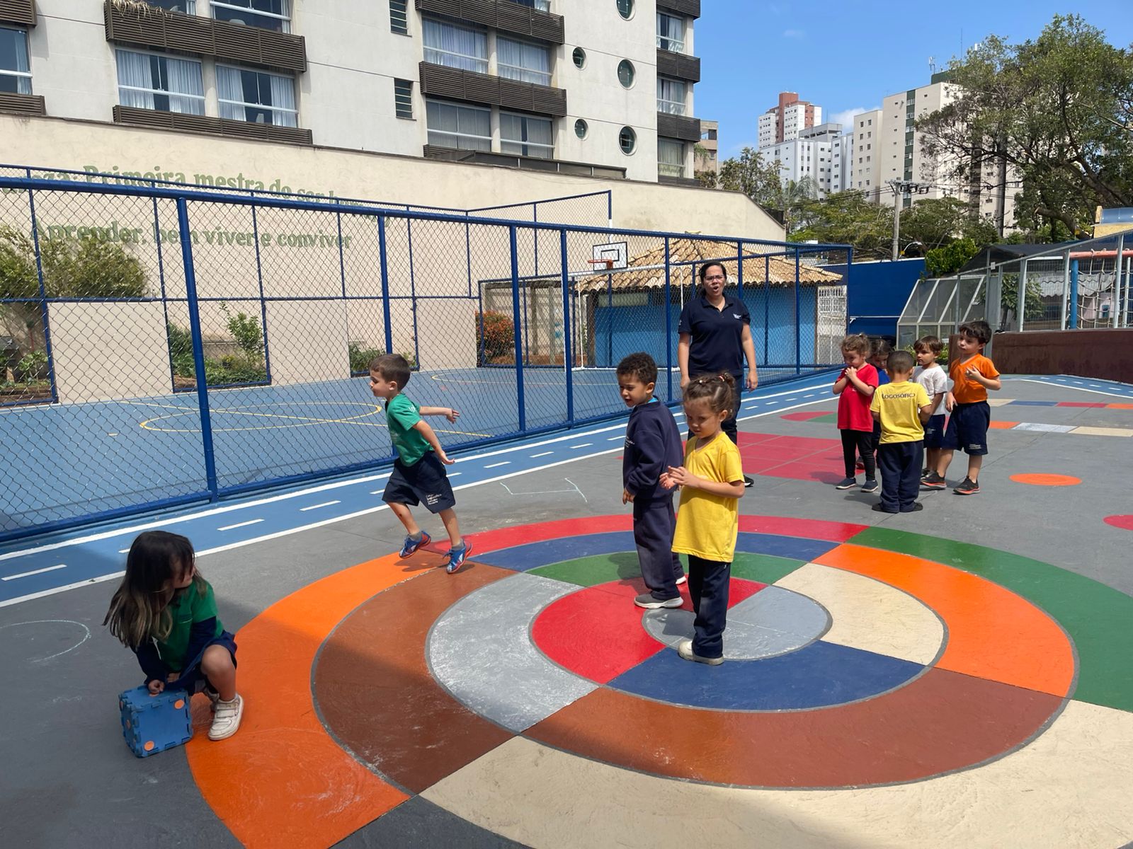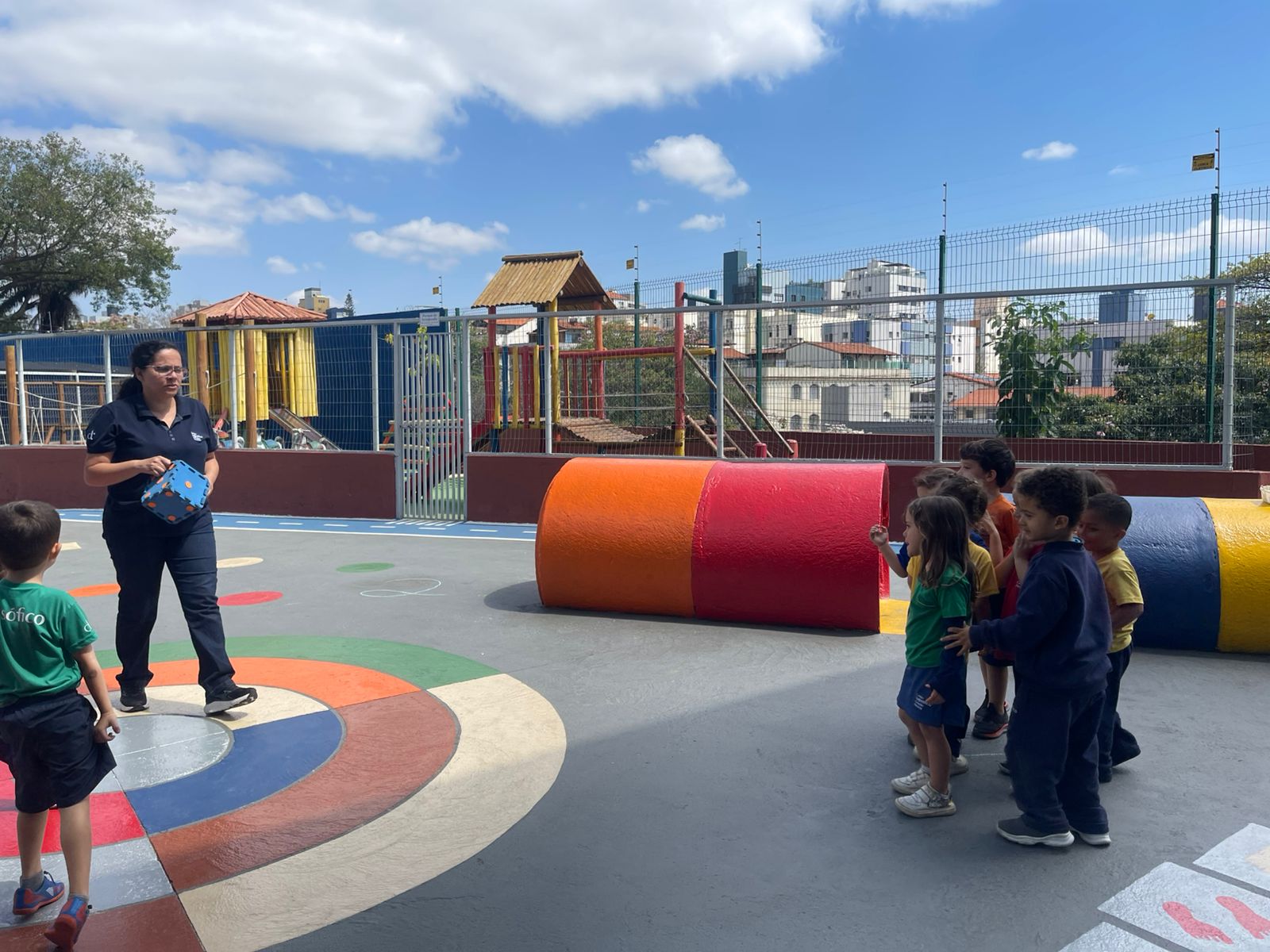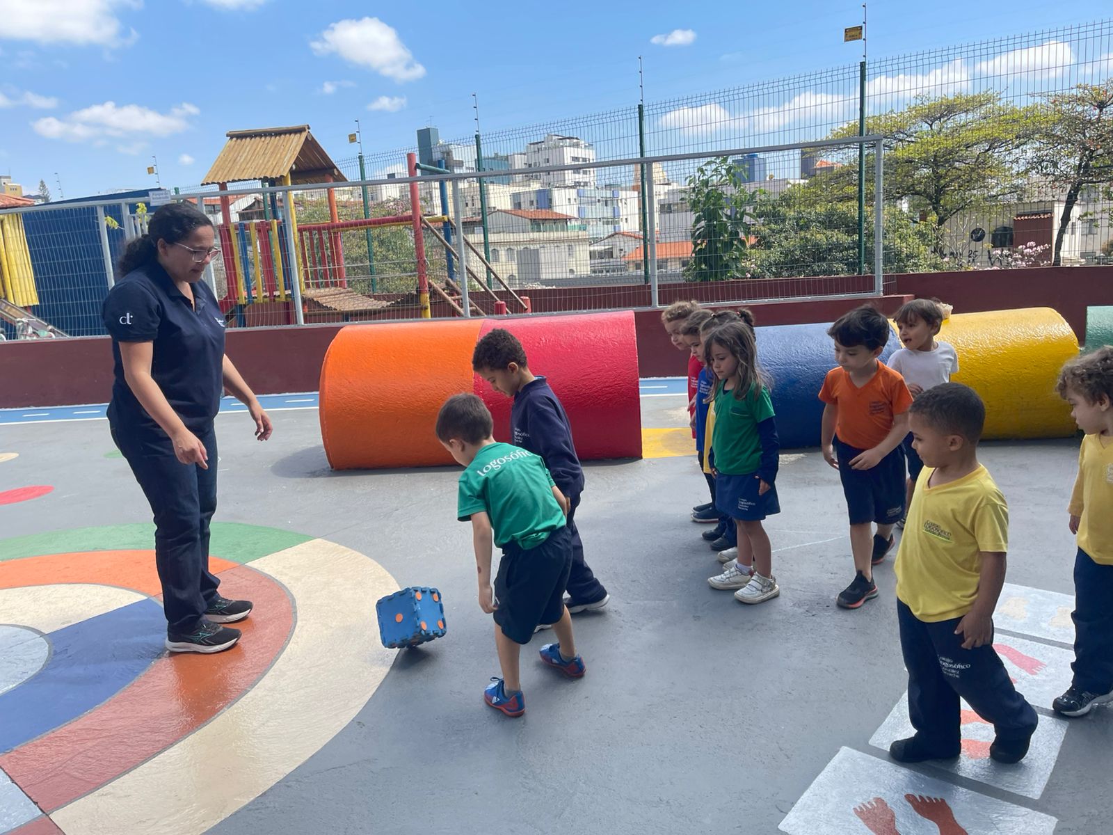 As professoras Regina Corrêa e Jessica Reis prepararam uma proposta que uniu movimento, atenção e raciocínio: em duplas, as crianças lançavam o dado gigante, contavam os pontinhos e procuravam, próximas ao túnel, o número correspondente desenhado no chão.