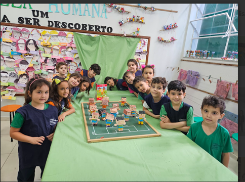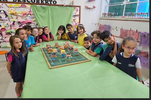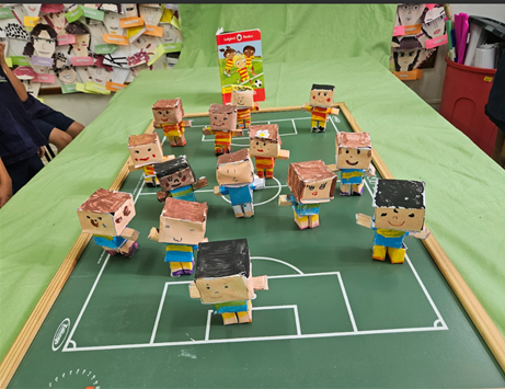 Os alunos do 1º ano participaram de uma proposta interdisciplinar nas aulas de Inglês e Artes, a partir da leitura do livro “Jon’s Football Team”. A narrativa envolvente serviu como ponto de partida para uma atividade prática e criativa: a construção do personagem Jon, utilizando diferentes materiais artísticos.