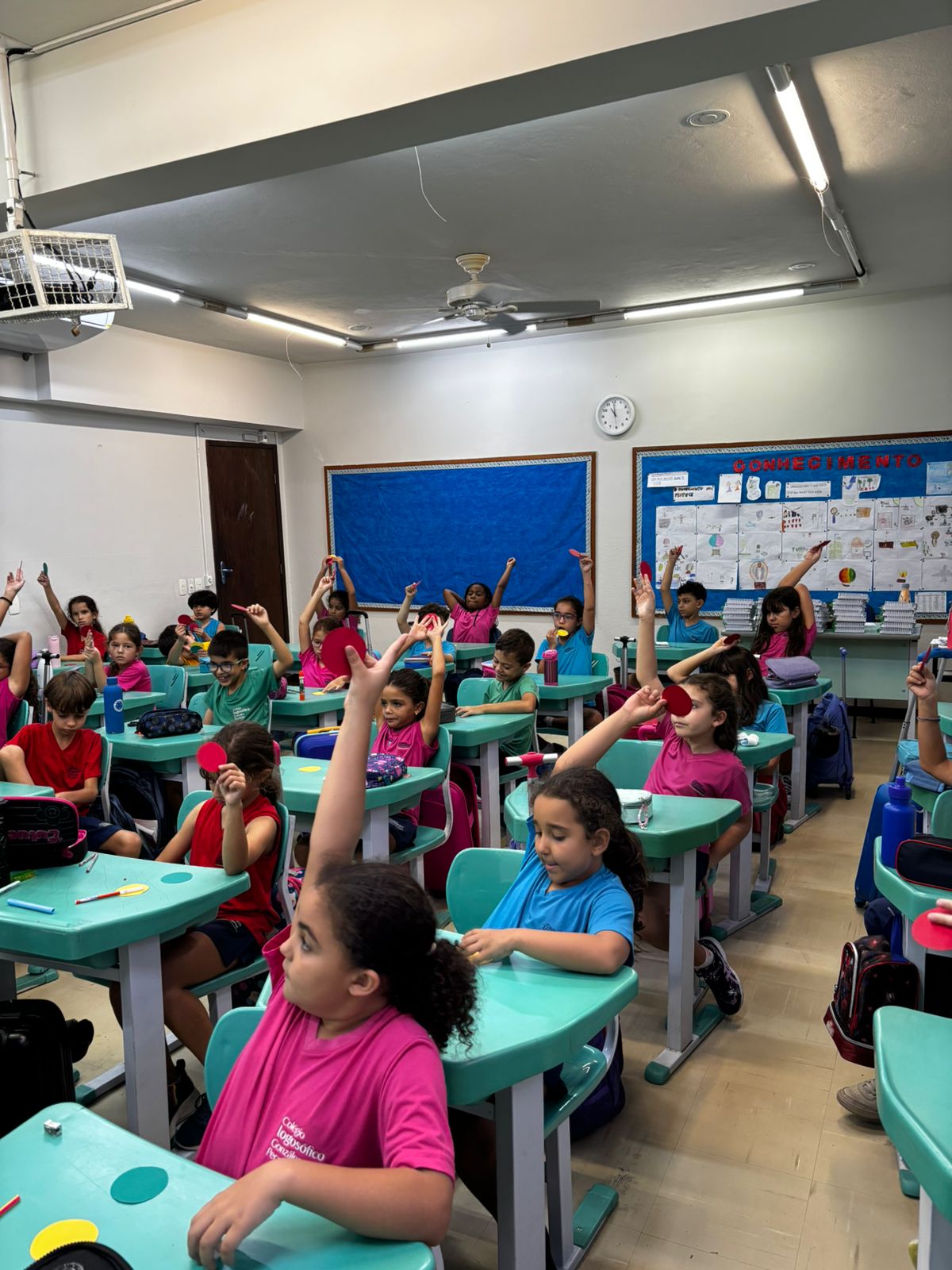 A cada situação classificada pelos alunos, a assessora aprofundava a reflexão: “Por que essa atitude é verde, amarela ou vermelha? Como podemos transformá-la em uma atitude verde?” Todos participaram ativamente, trazendo suas compreensões e reflexões.