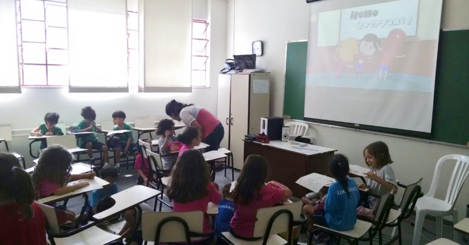 Na turma do Infantil 5, a professora de Inglês Alice Fajardo inicia as aulas utilizando músicas e vídeos, recursos que permitem aos alunos visualizarem imagens variadas e favorecem a assimilação da linguagem.