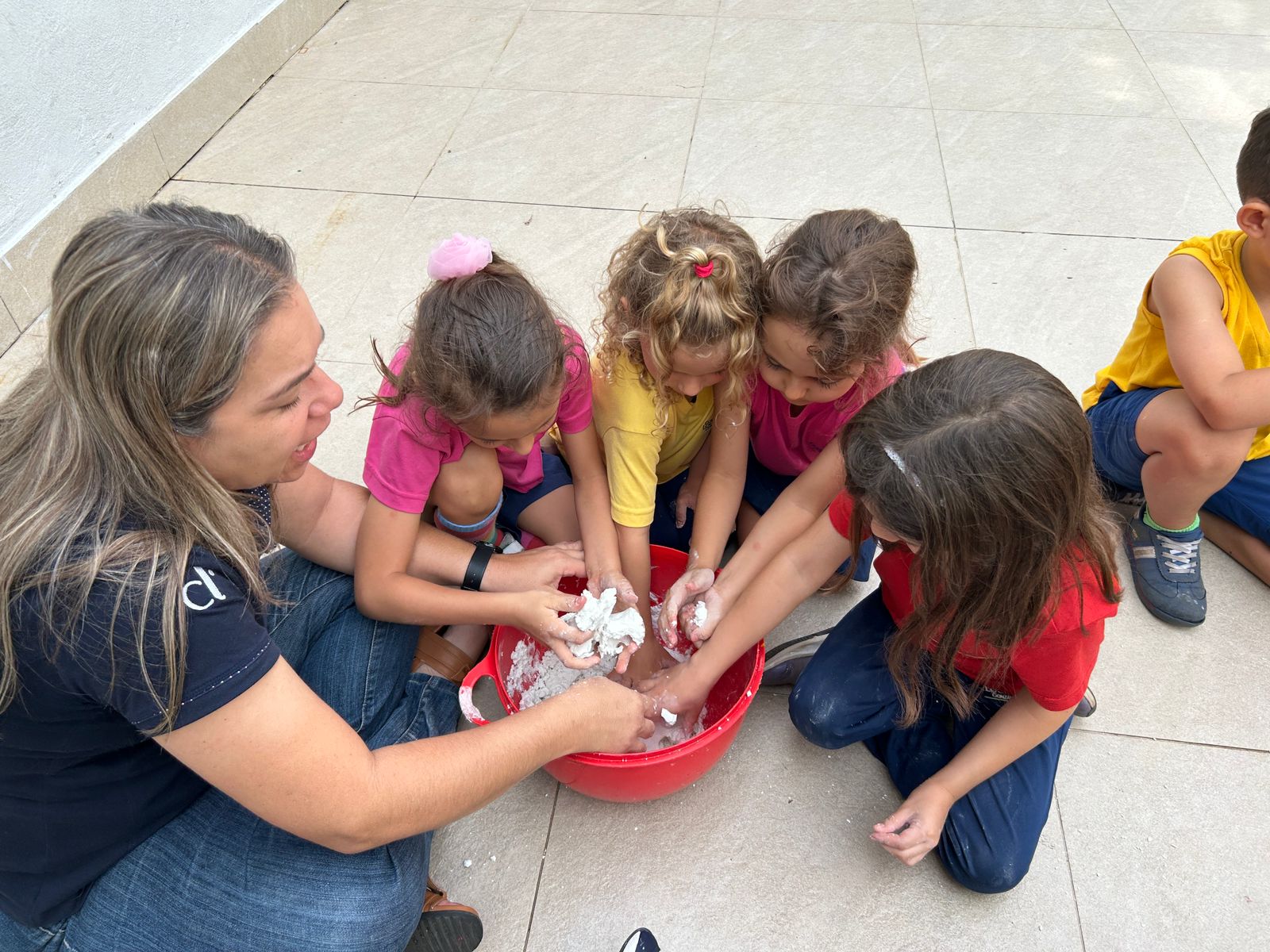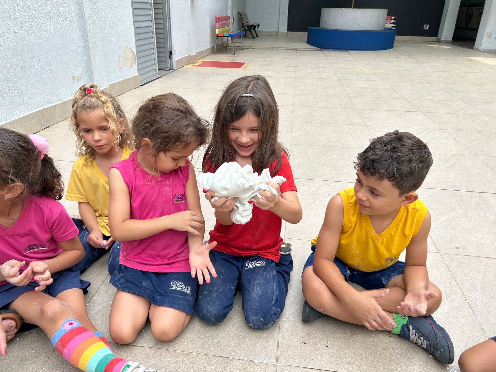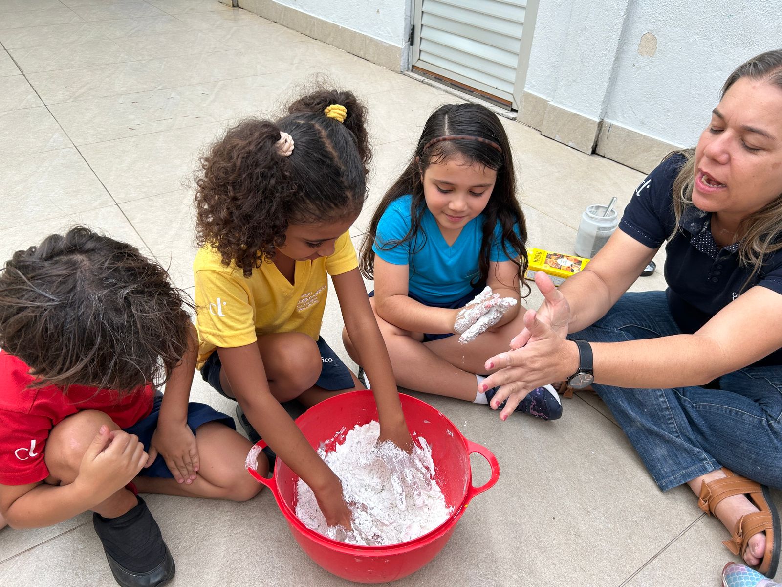 No “Projeto Criança”, a turma do Infantil 5 vivenciou uma atividade sensorial cheia de descobertas ao preparar sua própria massinha de modelar! A receita, feita com creme de cabelo e amido de milho, surpreendeu pela textura macia e suave – diferente do play dough tradicional – e despertou o entusiasmo das crianças.