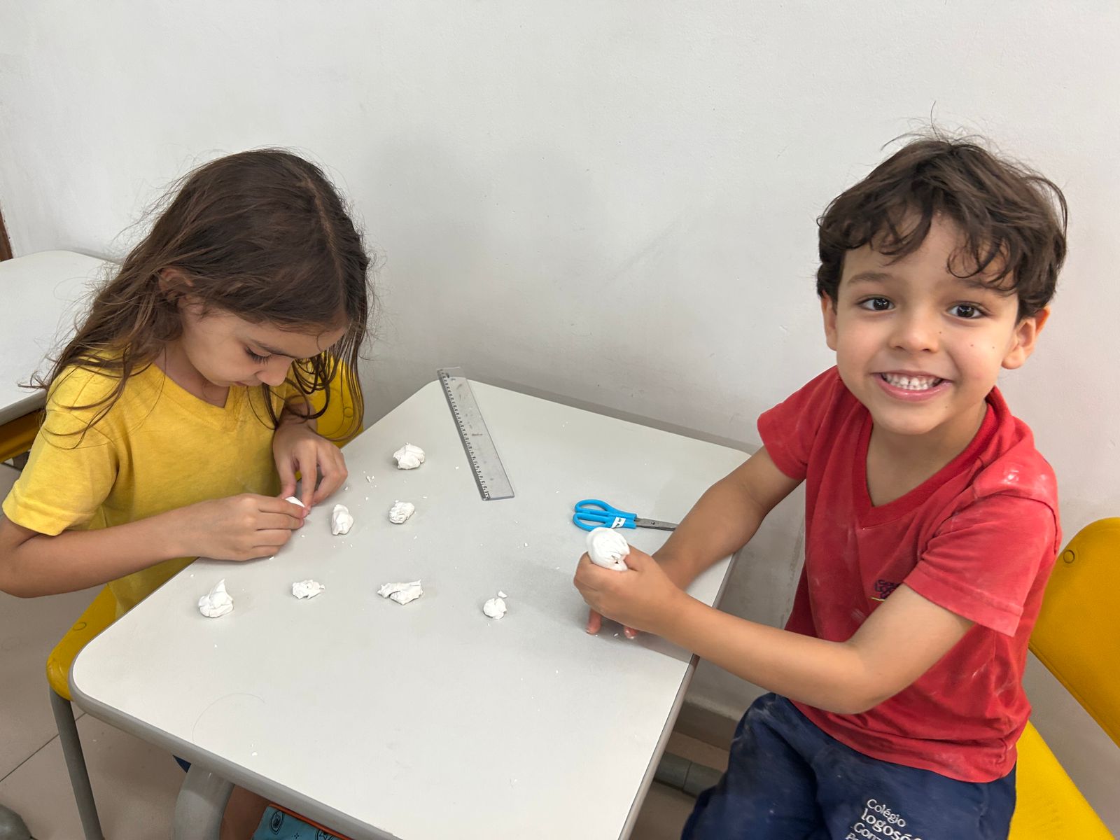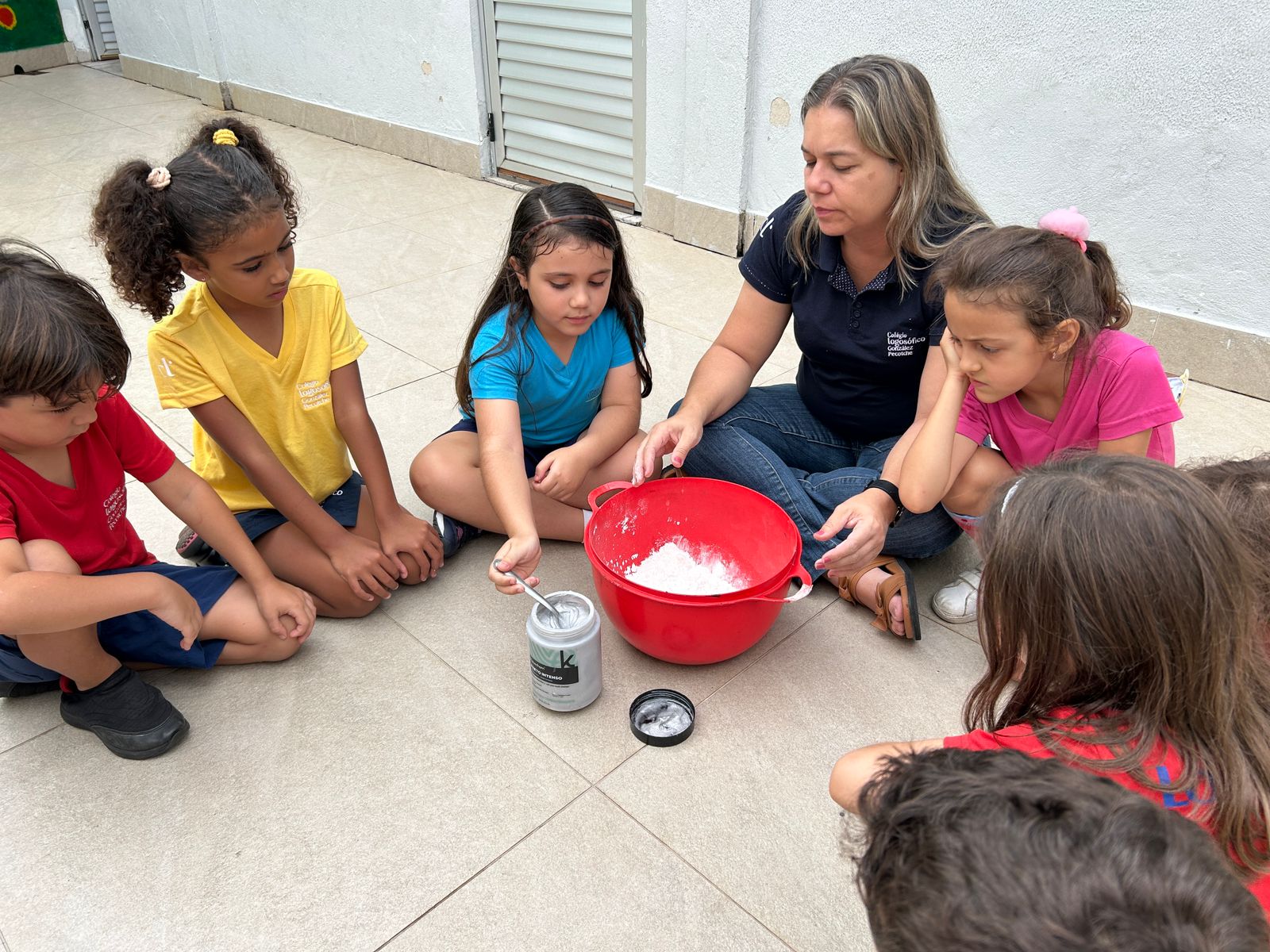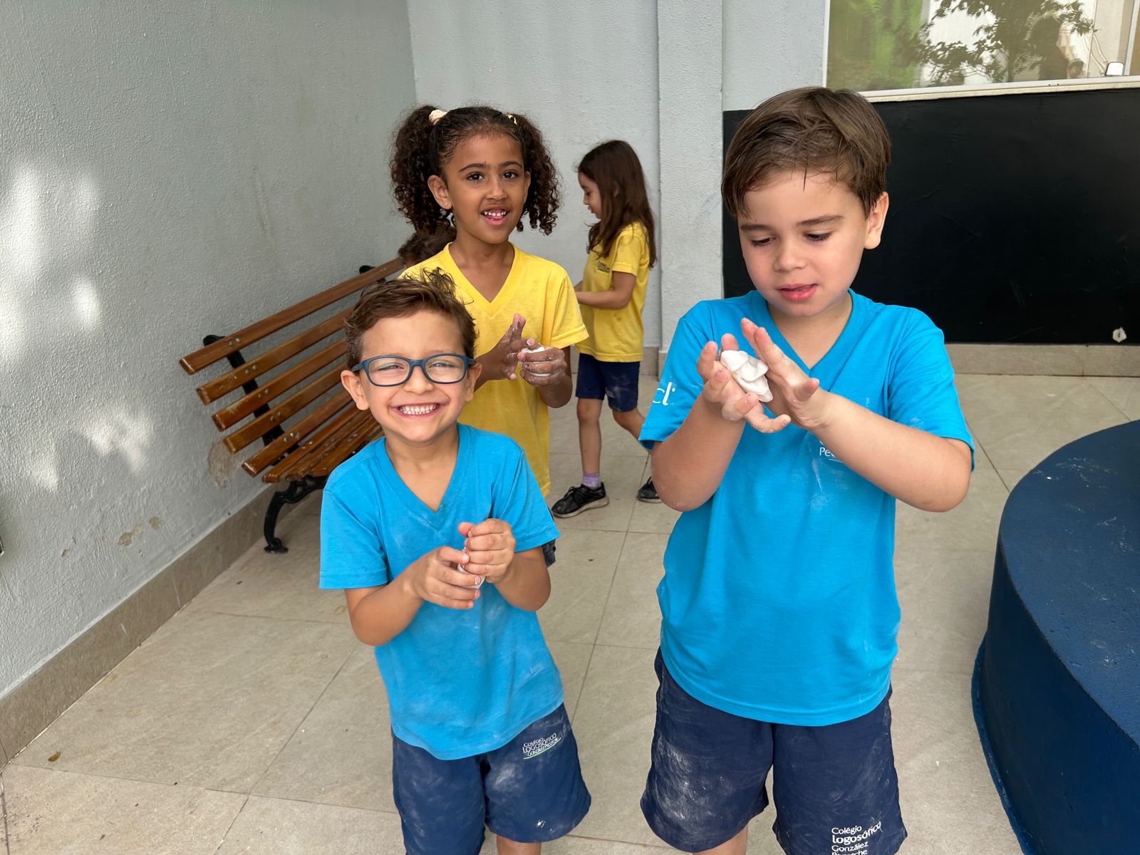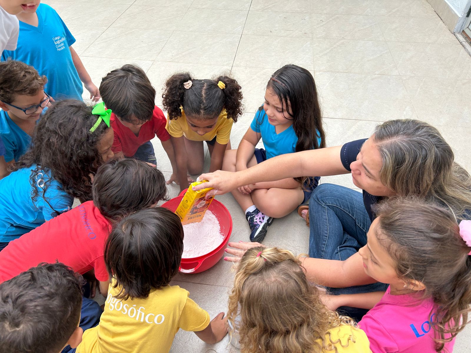 No “Projeto Criança”, a turma do Infantil 5 vivenciou uma atividade sensorial cheia de descobertas ao preparar sua própria massinha de modelar! A receita, feita com creme de cabelo e amido de milho, surpreendeu pela textura macia e suave – diferente do play dough tradicional – e despertou o entusiasmo das crianças.