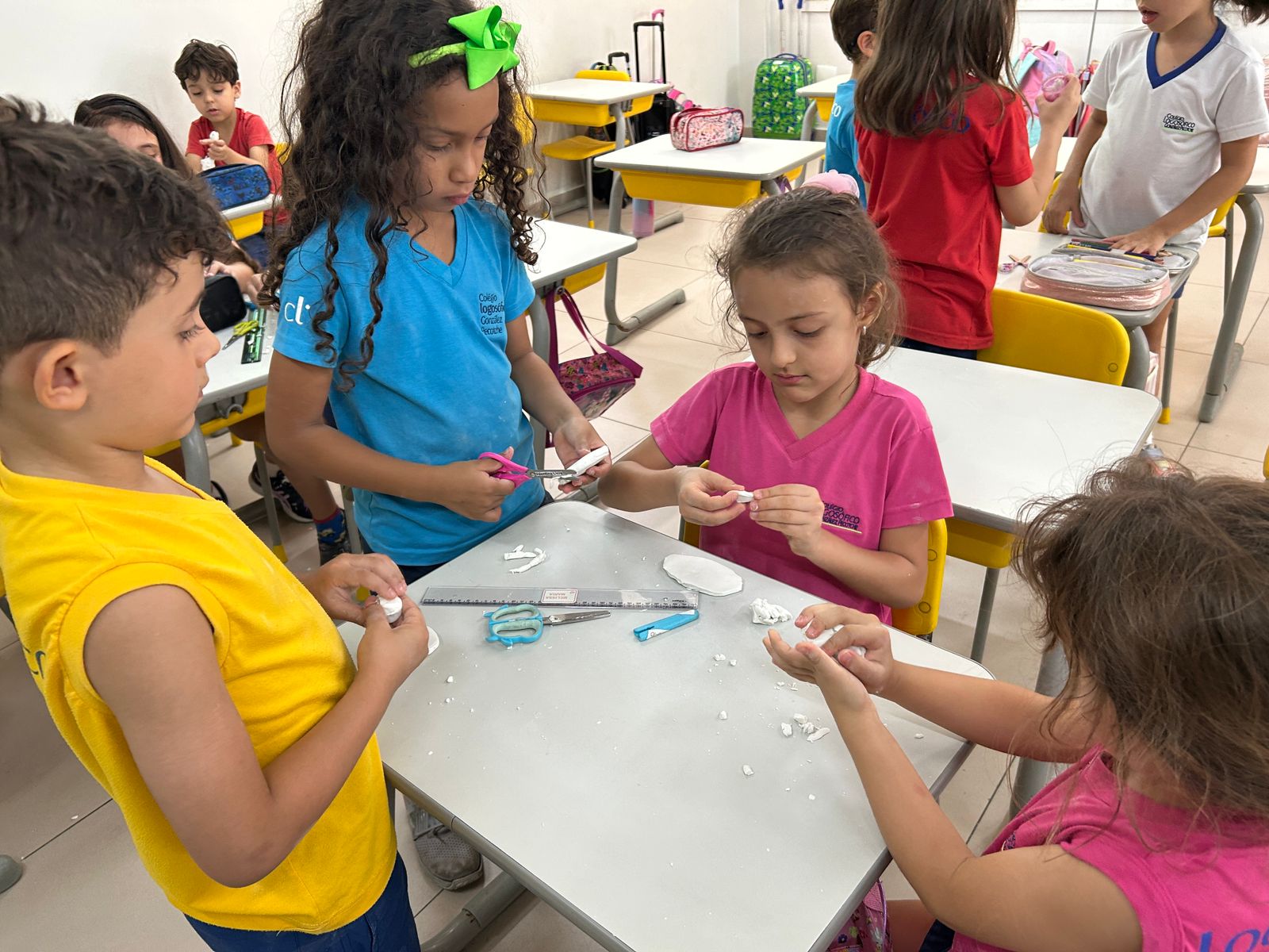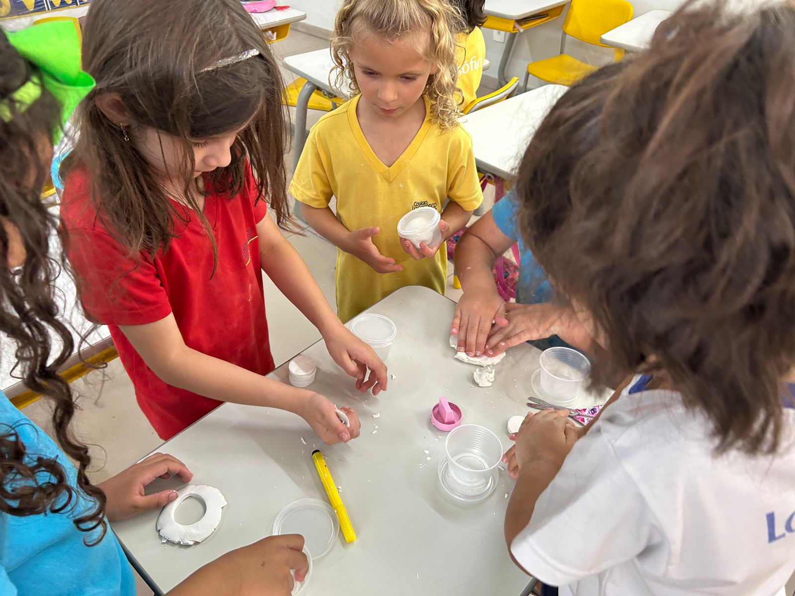 Depois de pronta, cada criança recebeu um pedaço da massinha e passou a explorar livremente, utilizando itens do próprio estojo, como tampas, apontadores e outros objetos para criar novas formas e texturas. A proposta ampliou a experimentação, a criatividade e a autonomia dos alunos.