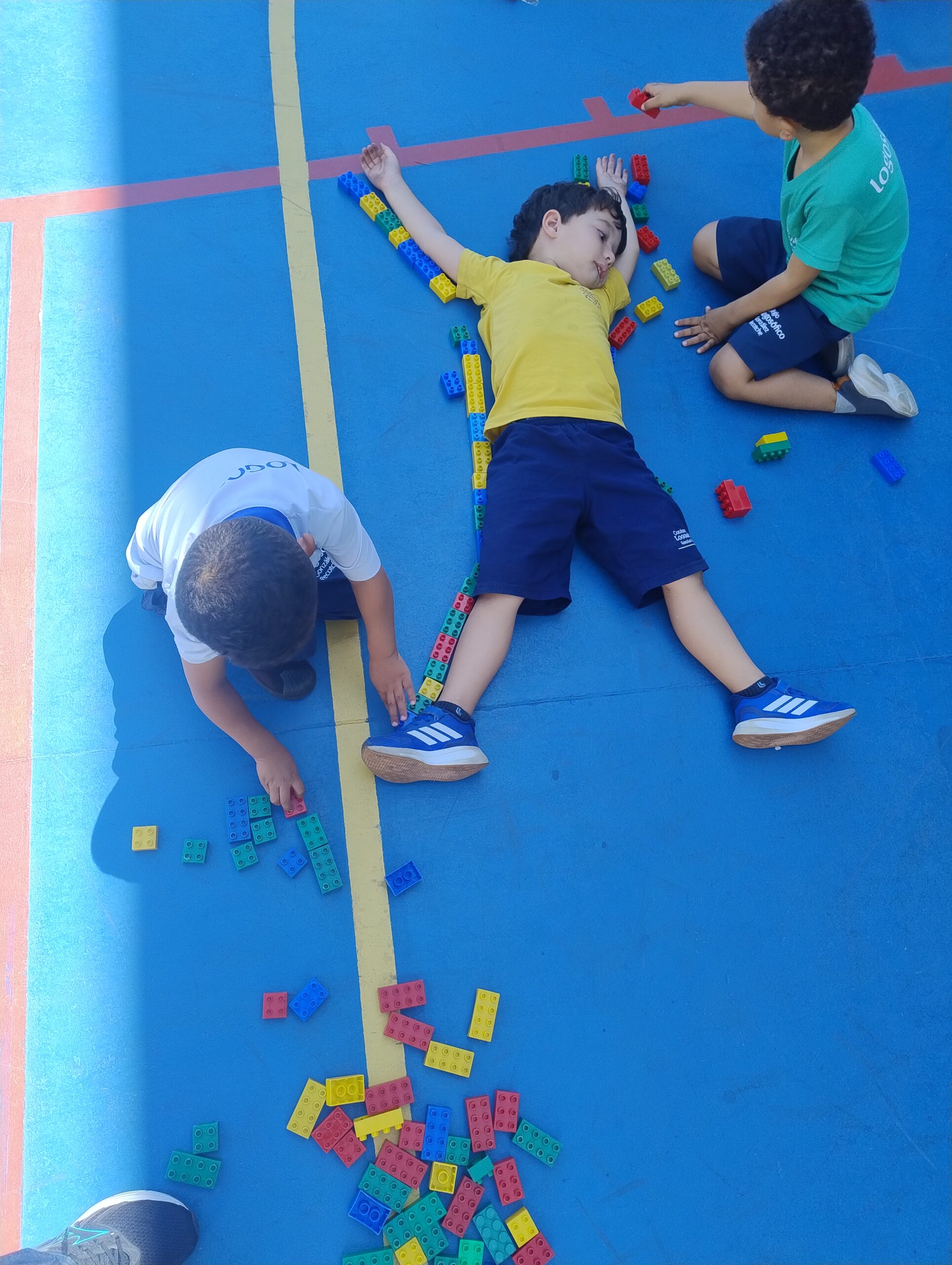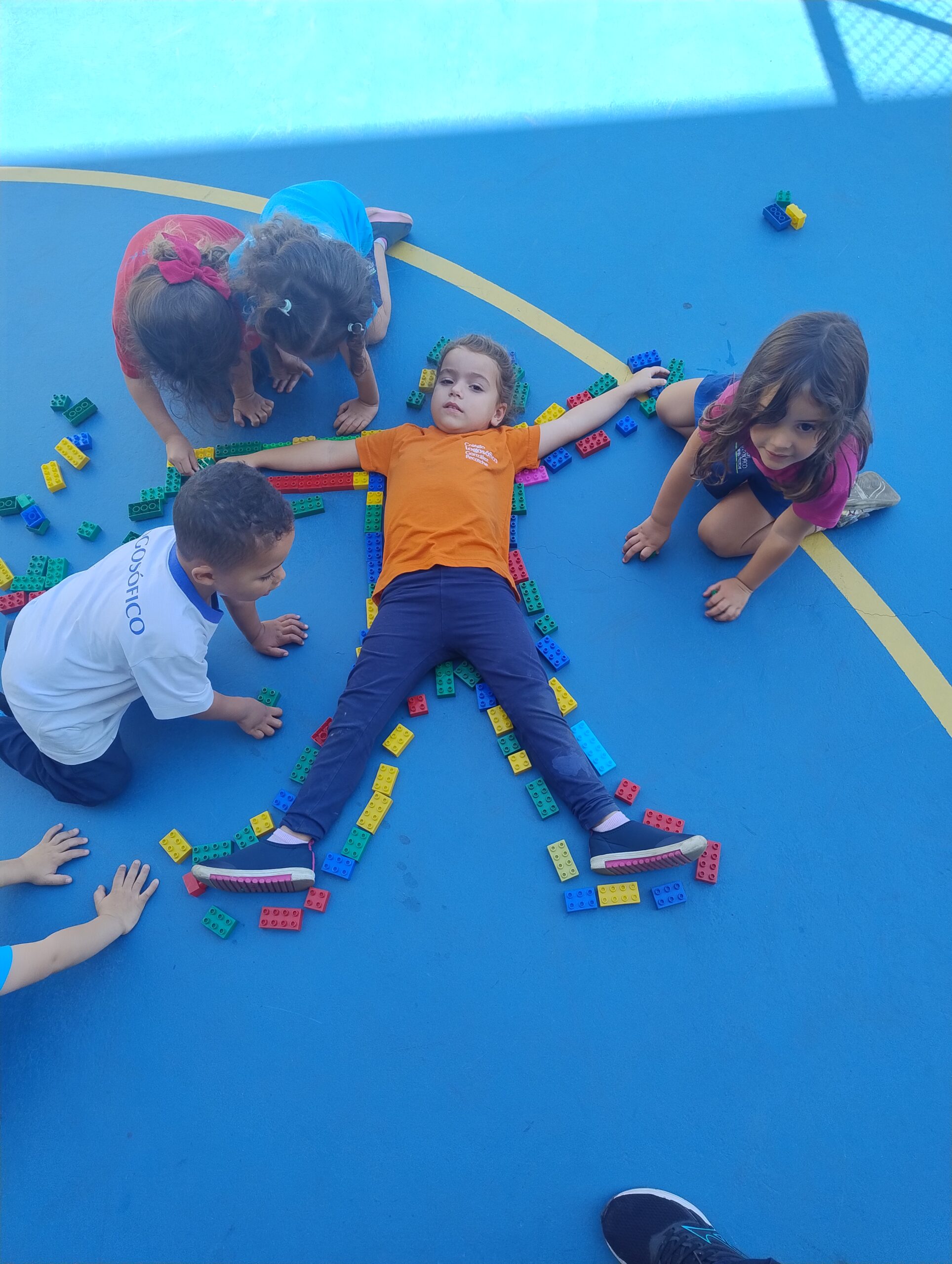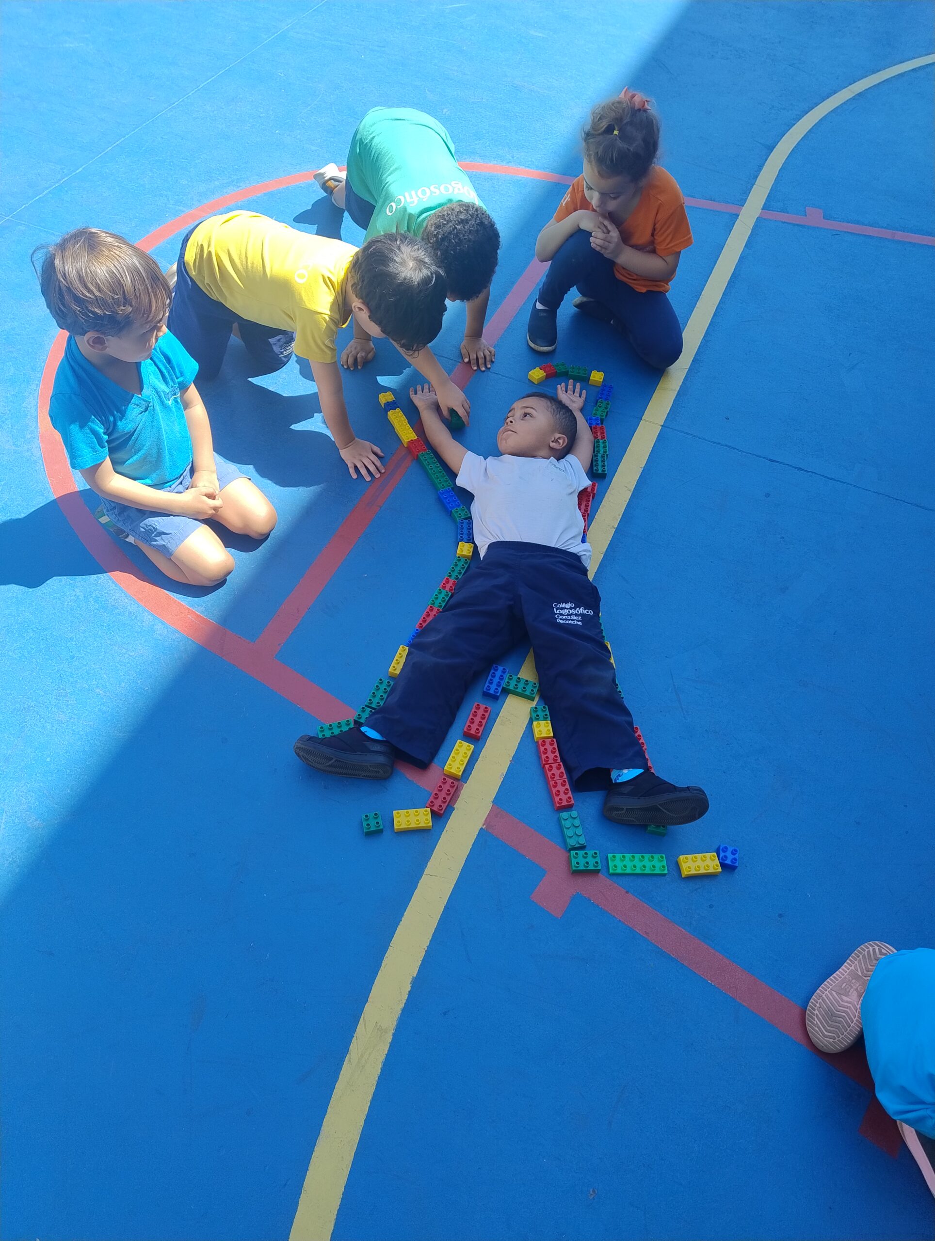 Cada aluno escolheu uma posição divertida para deitar no chão, enquanto os colegas, com atenção e entusiasmo, montavam o contorno do corpo com peças coloridas. O resultado foi surpreendente: formas únicas, repletas de expressão e criatividade.